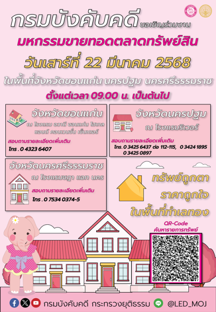 กรมบังคับคดี ขอเชิญร่วมงานมหกรรมขายทอดตลาดทรัพย์สิน “ทรัพย์ถูกตา ราคาถูกใจ ในพื้นที่ทำเลทอง” ในพื้นที่จังหวัดขอนแก่น นครปฐม และจังหวัดนครศรีธรรมราช วันเสาร์ที่ 22 มีนาคม 2568