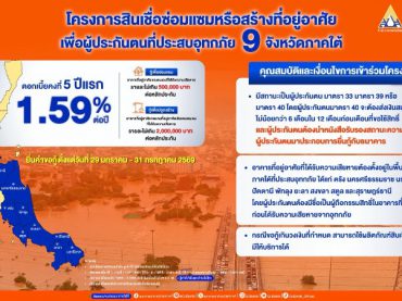 ธอส. ร่วมกับ สปส. เดินหน้าฟื้นฟู 9 จังหวัดภาคใต้ จัดทำสินเชื่อซ่อมแซมหรือสร้างที่อยู่อาศัยเพื่อผู้ประกันตนที่ประสบอุทกภัย อัตราดอกเบี้ย 5 ปีแรกเพียง 1.59% ต่อปี ผ่อนต่ำสุดเริ่มต้นเดือนละ 1,500 บาทเท่านั้น!