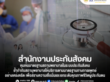 ประกันสังคมคุมเข้มมาตรฐานสถานพยาบาลในระบบประกันสังคม ย้ำกำกับสถานพยาบาลให้บริการตามมาตรฐานทางการแพทย์อย่างเคร่งครัด เพื่อสร้างความเชื่อมั่นและยกระดับคุณภาพชีวิตผู้ประกันตน