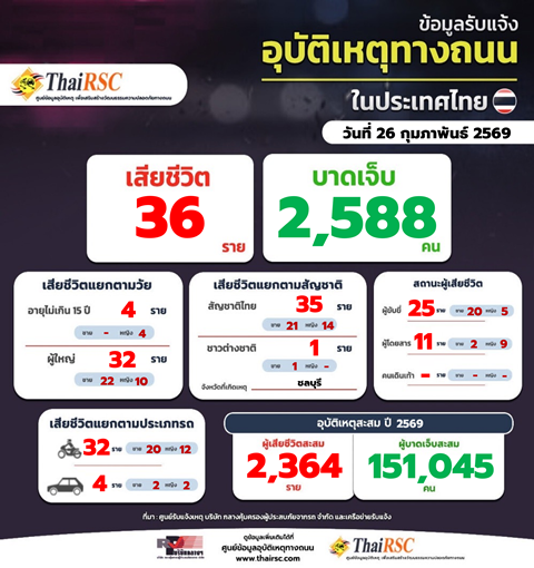 สถานการณ์อุบัติเหตุทางถนนในประเทศไทย วันที่ 26 ก.พ. 69 27 กุมภาพันธ์ 2026Thailandplusประชาสัมพันธ์ Facebook iconFacebookTwitter iconTwitterLINE iconLineสถานการณ์อุบัติเหตุทางถนนในประเทศไทย วันที่ 26 ก.พ. 69