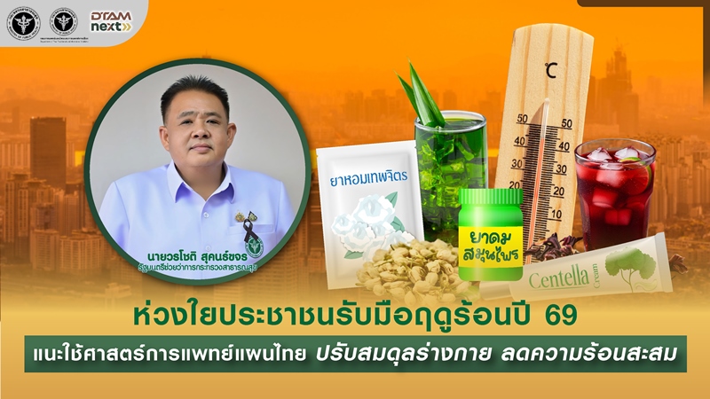 ทั้งนี้ กระทรวงสาธารณสุข โดยกรมการแพทย์แผนไทยและการแพทย์ทางเลือก ได้มุ่งเน้นการเผยแพร่ องค์ความรู้ด้านการดูแลสุขภาพตามศาสตร์การแพทย์แผนไทย เพื่อให้ประชาชนมีทางเลือกในการปรับตัวและ ดูแลตนเองให้ปลอดภัยสอดคล้องกับสภาพอากาศที่เปลี่ยนแปลง พร้อมแนะนำยาสมุนไพรที่ควรพกติดบ้าน ติดตัว ในช่วงฤดูร้อน เช่น ยาหอมเทพจิตร ยาดมสมุนไพร โลชันพญายอ ครีมบัวบก ยาเขียวหอม และช่วงฤดูร้อน ควรรับประทานน้ำสมุนไพรเพื่อช่วยปรับสมดุลร่างกาย เช่น น้ำลอยดอกมะลิ น้ำใบเตย น้ำบัวบก เป็นต้น และที่สำคัญ ประชาชนควรหลีกเลี่ยงการอยู่กลางแดดจัด สวมเสื้อผ้าสีอ่อนที่ระบายอากาศได้ดี ดื่มน้ำสะอาดอย่างน้อยวันละ 6–8 แก้ว และพักผ่อนให้เพียงพอ ก็จะช่วยให้ร่างกายไม่เจ็บป่วยช่วงฤดูร้อน