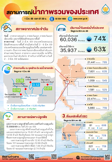 คาดการณ์ : วันที่ 2 มี.ค. 69 ประเทศไทยตอนบนมีฝนฟ้าคะนองบางพื้นที่ ส่วนในช่วงวันที่ 3 – 6 มี.ค. 69 ประเทศไทยตอนบนจะมีพายุฤดูร้อนเกิดขึ้น และฝนตกหนักบางแห่ง เริ่มจากภาคตะวันออกเฉียงเหนือลำดับแรก ส่วนภาคตะวันออก ภาคกลาง และภาคเหนือ จะได้รับผลกระทบในลำดับถัดไป สำหรับภาคใต้ในช่วงวันที่ 2 – 3 มี.ค. 69 จะมีฝนลดลง