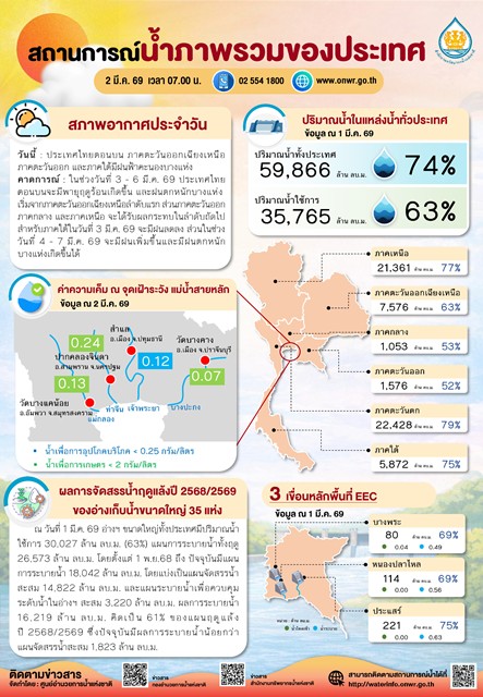 6. ผลการจัดสรรน้ำฤดูแล้งปี 2568/2569 ของอ่างเก็บน้ำขนาดใหญ่ 35 แห่ง : ณ วันที่ 1 มี.ค. 69 อ่างฯ ขนาดใหญ่ทั้งประเทศมีปริมาณน้ำใช้การ 30,027 ล้าน ลบ.ม. (63%) แผนการระบายน้ำทั้งฤดู 26,573 ล้าน ลบ.ม. โดยตั้งแต่ 1 พ.ย.68 ถึง ปัจจุบันมีแผนการระบายน้ำ 18,042 ล้าน ลบ.ม. โดยแบ่งเป็นแผนจัดสรรน้ำสะสม 14,822 ล้าน ลบ.ม. และแผนระบายน้ำเพื่อควบคุมระดับน้ำในอ่างฯ สะสม 3,220 ล้าน ลบ.ม. ผลการระบายน้ำ 16,219 ล้าน ลบ.ม. คิดเป็น 61% ของแผนฤดูแล้งปี 2568/2569 ซึ่งปัจจุบันมีผลการระบายน้ำน้อยกว่าแผนจัดสรรน้ำสะสม 1,823 ล้าน ลบ.ม.