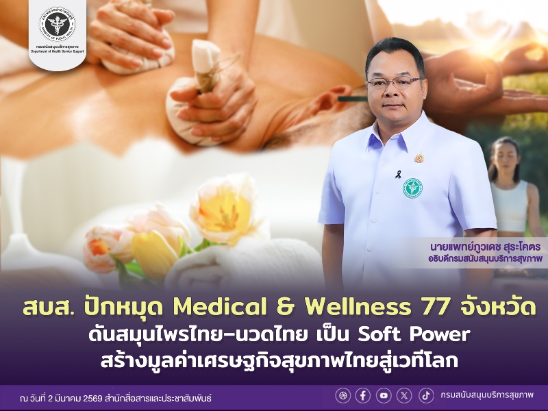 นอกจากนี้ กรม สบส. ในการผลักดันอุตสาหกรรม Medical & Wellness ให้เป็นหนึ่งในกลไกลเศรษฐกิจใหม่ของประเทศ โดยใช้ สมุนไพรไทย–นวดไทย เป็น Soft Power ด้านสุขภาพที่มีอัตลักษณ์โดดเด่น สร้างความเชื่อมั่นในมาตรฐาน สร้างรายได้สู่ชุมชน และยกระดับประเทศไทยสู่การเป็นศูนย์กลางสุขภาพและเวลเนสของภูมิภาคอย่างยั่งยืน