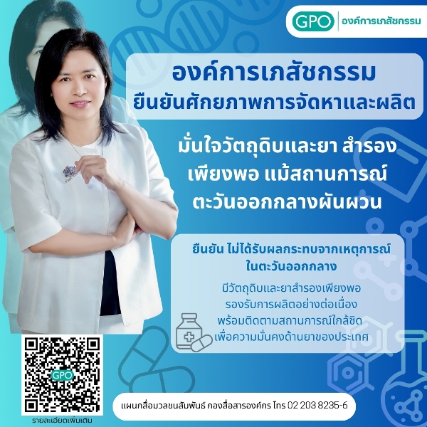 “องค์การเภสัชกรรมขอยืนยันว่า ปัจจุบันยังไม่ได้รับผลกระทบจากสถานการณ์ดังกล่าว โดยมีทั้งวัตถุดิบ ยาสำเร็จรูป และเวชภัณฑ์สำรองในระดับที่เพียงพอ สามารถรองรับการผลิตและการกระจายยาได้อย่างต่อเนื่อง ทั้งนี้ ได้มีการบริหารจัดการห่วงโซ่อุปทานอย่างใกล้ชิด พร้อมประสานความร่วมมือกับหน่วยงานที่เกี่ยวข้องและคู่ค้าทั้งในและต่างประเทศอย่างต่อเนื่อง เพื่อปรับแผนการจัดหา การสำรอง และการผลิตให้สอดคล้องกับสถานการณ์ที่อาจเปลี่ยนแปลงได้ตลอดเวลา โดยมีเป้าหมายสำคัญเพื่อสร้างความมั่นคงด้านยา และดูแลประชาชนให้ได้รับการรักษาอย่างต่อเนื่องและทันท่วงที” ผู้อำนวยการองค์การเภสัชกรรม กล่าว