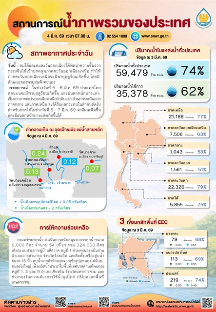 สรุปสถานการณ์น้ำภาพรวมของประเทศ วันที่ 4 มี.ค. 69 เวลา 7.00 น.