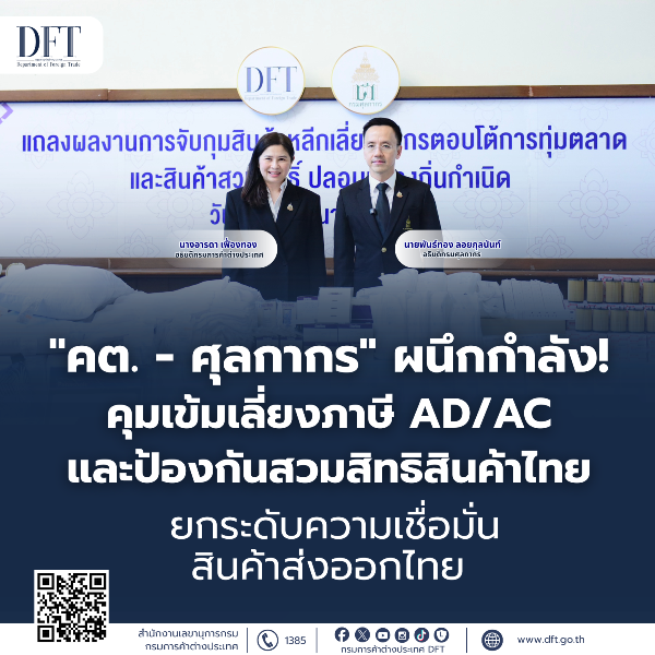 กรมการค้าต่างประเทศผนึกกำลังกรมศุลกากร ยกระดับมาตรการตรวจสอบเข้มข้น สกัดกั้นการหลบเลี่ยงอากร AD/AC และขบวนการสวมสิทธิกำเนิดสินค้าไทย หวังปกป้องความเชื่อมั่นอุตสาหกรรมการผลิตในประเทศ ลดความเสี่ยงถูกประเทศคู่ค้าใช้มาตรการตอบโต้ เพื่อรักษาขีดความสามารถและสร้างความเชื่อมั่นให้สินค้าไทยในเวทีโลก