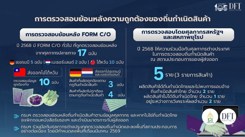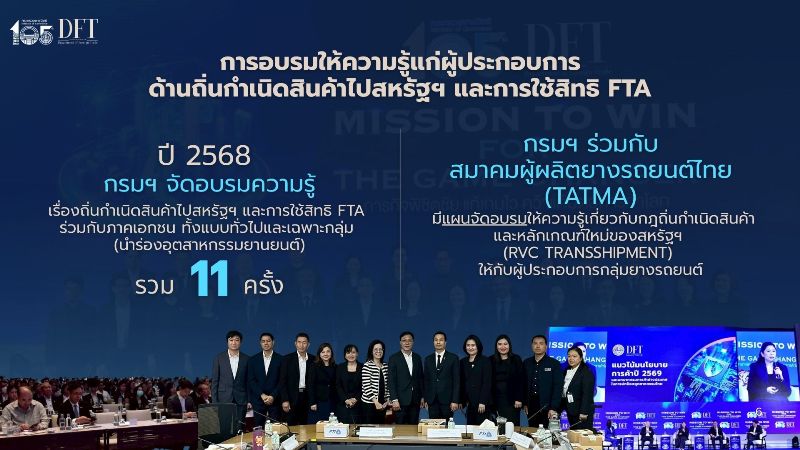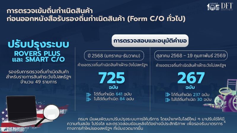 นางอารดาฯ กล่าวเพิ่มเติมว่า ผลการดำเนินงานของ คต. ในด้านการตรวจสอบถิ่นกำเนิดสินค้าก่อนออกหนังสือรับรอง (Form C/O ทั่วไป) ผ่านระบบไร้กระดาษ ROVERs Plus ในปี 2568 มีการตรวจสอบและอนุมัติรวมทั้งสิ้น 725 คำขอ พบเป็นสินค้าได้ถิ่นกำเนิดไทย 641 คำขอ และไม่ได้ถิ่นกำเนิดไทย 84 คำขอ โดยกลุ่มสินค้าสำคัญที่ผ่านการตรวจสอบเข้มข้น ได้แก่ เฟอร์นิเจอร์ไม้ สายดาต้าเคเบิล และส่วนประกอบรถยนต์ ทั้งนี้ คต. มีแผนนำเทคโนโลยีสมัยใหม่มาพัฒนาระบบให้บริการอย่างต่อเนื่องเพื่อเพิ่มประสิทธิภาพการตรวจสอบย้อนกลับและยังให้ความสำคัญกับการเสริมสร้างความรู้แก่ผู้ประกอบการ โดยบูรณาการร่วมกับภาคเอกชน อาทิ สภาผู้ส่งสินค้าทางเรือฯ สภาอุตสาหกรรมฯ สสว. และผู้ประกอบการทั่วไป ในการจัดอบรมทั้งในรูปแบบ Online และ Onsite รวม 11 ครั้ง เพื่อเตรียมความพร้อมรับมือหลักเกณฑ์การตรวจสอบที่เข้มงวดของสหรัฐฯ โดยเฉพาะเกณฑ์สัดส่วนวัตถุดิบภายในภูมิภาคและการป้องกันการสวมสิทธิ (RVC-Transshipment) ซึ่งล่าสุดเมื่อเดือนมกราคม 2569 คต. ได้นำร่องจัดอบรมเชิงลึกแบบเฉพาะกลุ่ม (Focus Group) ให้กับอุตสาหกรรมยานยนต์ เพื่อให้คำแนะนำที่สอดคล้องกับลักษณะธุรกิจเฉพาะรายได้อย่างตรงจุด การดำเนินงานเชิงรุกครั้งนี้มุ่งเน้นสร้างความเข้าใจในมาตรฐานสากลและกฎระเบียบการค้าโลกที่เปลี่ยนแปลงไป เพื่อรักษาความเชื่อมั่นในสินค้าไทยและสร้างความได้เปรียบทางการค้าอย่างยั่งยืนภายใต้กรอบ FTA และข้อตกลงทางการค้าต่างๆ