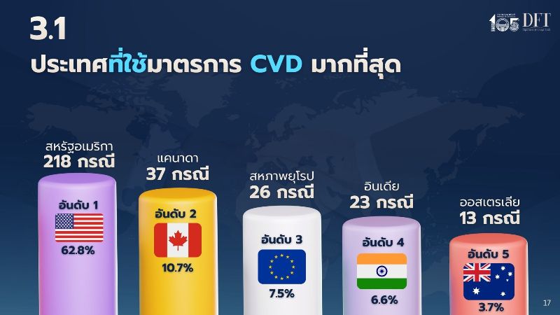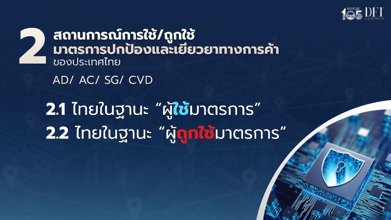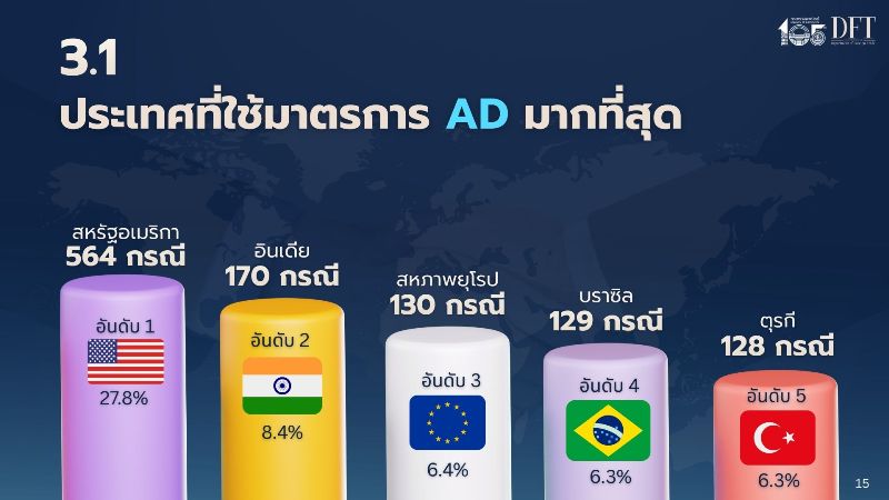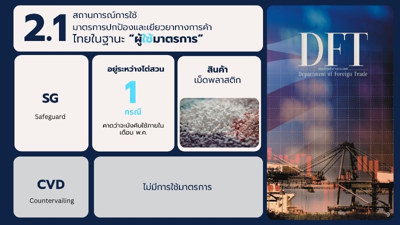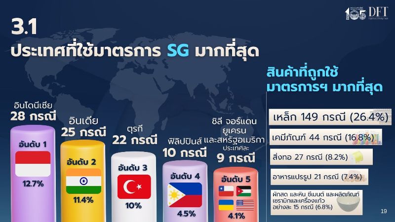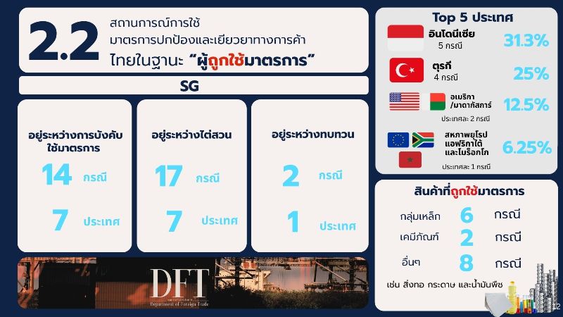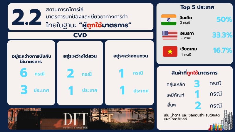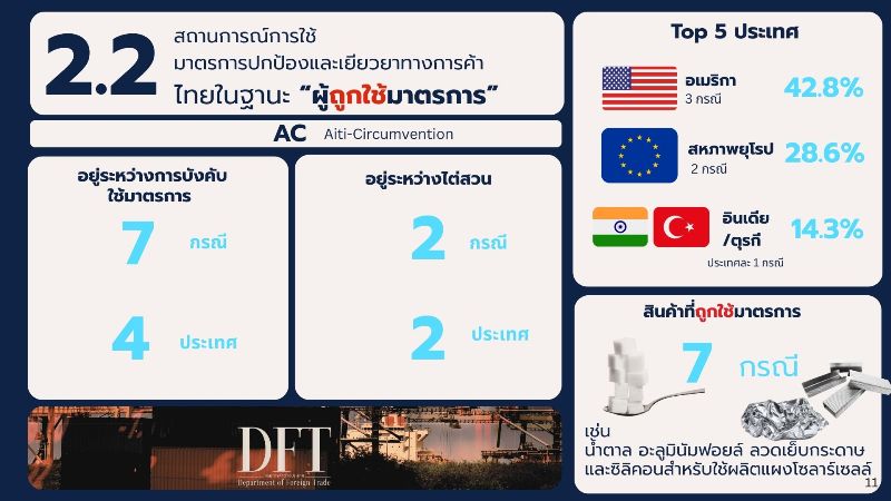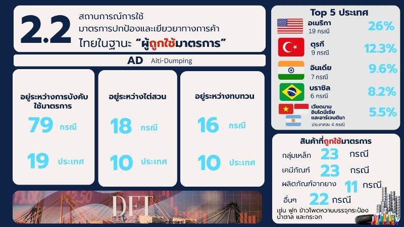 ในขณะเดียวกัน ภาคการส่งออกของไทยกำลังเผชิญความท้าทายอย่างหนัก ปัจจุบันประเทศไทยรั้งอันดับ 5 ของโลกที่ถูกใช้มาตรการ AD มากที่สุด รวมทั้งสิ้น 79 กรณี จาก 19 ประเทศ ซึ่งมีสหรัฐฯ เป็นผู้นำการใช้มาตรการกับไทยถึง 19 กรณี ตามด้วยตุรกีและอินเดีย โดยกลุ่มสินค้าเป้าหมายหลักยังคงเป็นเหล็ก เคมีภัณฑ์ และผลิตภัณฑ์ยาง นอกจากนี้ ไทยยังถูกใช้มาตรการตอบโต้การอุดหนุน (CVD) อีก 6 กรณี ซึ่งมีอินเดียเป็นผู้ใช้หลักถึงร้อยละ 50 ในกลุ่มสินค้าเหล็ก เคมีภัณฑ์ น้ำตาล และซิลิคอนสำหรับแผงโซลาร์เซลล์ สำหรับมาตรการปกป้อง (SG) ไทยถูกบังคับใช้แล้ว 14 กรณี และอยู่ระหว่างการไต่สวนอีกถึง 17 กรณี โดยมี อินโดนีเซีย เป็นคู่กรณีหลัก (ร้อยละ 31.3) เน้นกลุ่มสินค้าสิ่งทอและกระดาษ อีกทั้งยังเผชิญมาตรการตอบโต้การหลบเลี่ยง (AC) อีก 7 กรณี จากสหรัฐฯ และสหภาพยุโรป ในกลุ่มสินค้ากลุ่มน้ำตาล อะลูมินั่มฟอยล์ และลวดเย็บกระดาษ จากสถิติเหล่านี้สะท้อนให้เห็นว่าไทยกำลังตกอยู่ท่ามกลางกระแสการกีดกันทางการค้าที่รุนแรง ซึ่งสอดคล้องกับทิศทางโลกภายใต้กฎกติกา WTO ที่ประเทศมหาอำนาจหันมาใช้เครื่องมือเหล่านี้ปกป้องผลประโยชน์ตนเอง ผู้ประกอบการไทยจึงจำเป็นต้องเร่งศึกษาเกณฑ์การค้าสากลและเตรียมความพร้อมรับมืออย่างทันถ่วงที