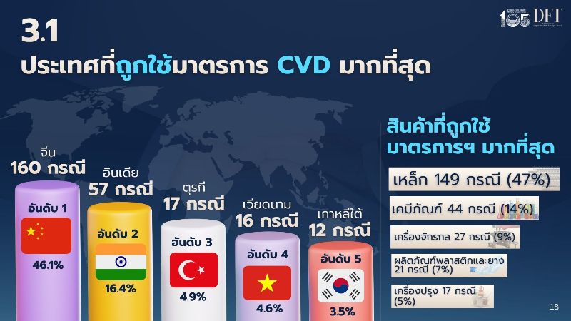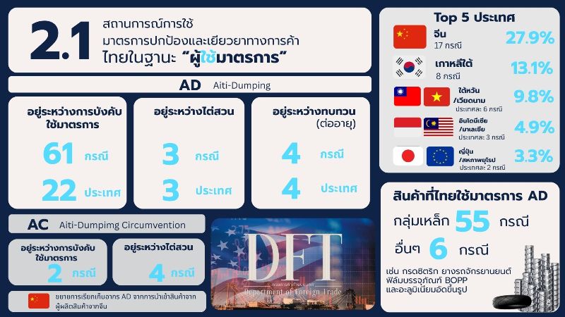 จากสถานการณ์การค้าโลกในปัจจุบันทวีความรุนแรงมากขึ้น ส่งผลให้ประเทศต่างๆ มีการใช้มาตรการเยียวยาทางการค้า (Trade Remedies) เพิ่มมากขึ้น โดยล่าสุดประเทศไทยมีการบังคับใช้มาตรการตอบโต้การทุ่มตลาด (AD) รวมทั้งสิ้น 61 กรณี จาก 22 ประเทศ ซึ่งจีนยังคงเป็นประเทศหลักที่ถูกไทยใช้มาตรการมากที่สุดถึง 17 กรณี (ร้อยละ 27.9) รองลงมา คือ เกาหลีใต้ 8 กรณี ตามด้วยเวียดนามและไต้หวันประเทศละ 6 กรณี โดยกลุ่มสินค้าเหล็กครองแชมป์ถูกใช้มาตรการสูงสุดถึง 55 กรณี นอกจากนี้ยังมีสินค้าสำคัญอื่น ๆ อีก 6 กรณี ได้แก่ กรดซิทริก ยางรถจักรยานยนต์ ฟิล์มบรรจุภัณฑ์ BOPP และอะลูมิเนียมอัดขึ้นรูป พร้อมกันนี้ไทยยังได้ใช้มาตรการตอบโต้การหลบเลี่ยง (AC) กับสินค้าจีนอีก 2 กรณี และอยู่ระหว่างไต่สวนมาตรการปกป้องการนำเข้าที่เพิ่มขึ้น (SG) อีก 1 กรณี เพื่อสกัดสินค้าทุ่มตลาดที่สร้างความเสียหายต่ออุตสาหกรรมภายใน
