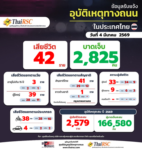 สถานการณ์อุบัติเหตุทางถนนในประเทศไทย วันที่ 4 มี.ค.69 5 มีนาคม 2026Thailandplusประชาสัมพันธ์ Facebook iconFacebookTwitter iconTwitterLINE iconLineสถานการณ์อุบัติเหตุทางถนนในประเทศไทย วันที่ 4 มี.ค.69