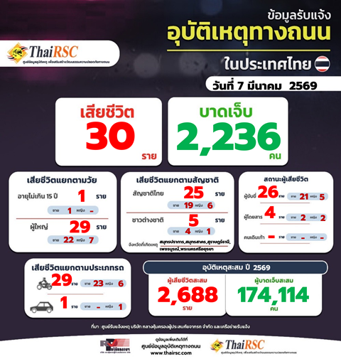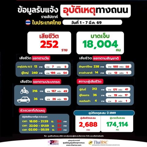 สถานการณ์อุบัติเหตุทางถนนในประเทศไทย รายสัปดาห์ 1-7 มี.ค.69 8 มีนาคม 2026Thailandplusประชาสัมพันธ์ Facebook iconFacebookTwitter iconTwitterLINE iconLineสถานการณ์อุบัติเหตุทางถนนในประเทศไทย วันที่ 7 มี.ค.69