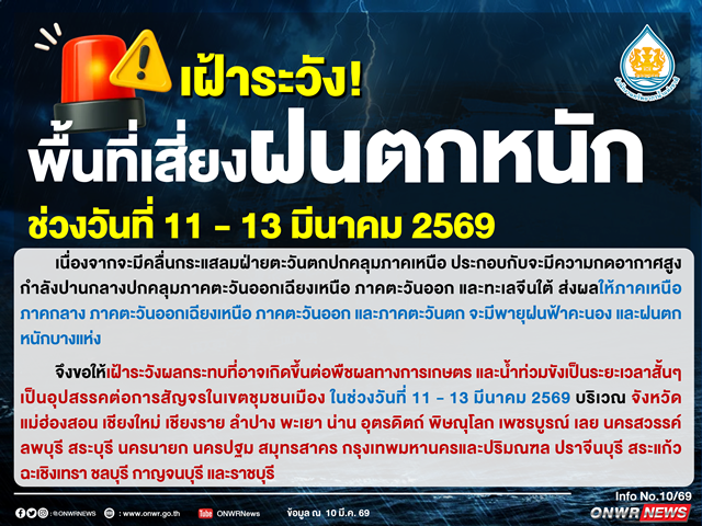 จึงขอให้เฝ้าระวังผลกระทบที่อาจเกิดขึ้นต่อพืชผลทางการเกษตร และน้ำท่วมขังเป็นระยะเวลาสั้นๆ เป็นอุปสรรคต่อการสัญจรในเขตชุมชนเมือง ในช่วงวันที่ 11 – 13 มีนาคม 2569 บริเวณ จังหวัดแม่ฮ่องสอน เชียงใหม่ เชียงราย ลำปาง พะเยา น่าน อุตรดิตถ์ พิษณุโลก เพชรบูรณ์ เลย นครสวรรค์ ลพบุรี สระบุรี นครนายก นครปฐม สมุทรสาคร กรุงเทพมหานครและปริมณฑล ปราจีนบุรี สระแก้ว ฉะเชิงเทรา ชลบุรี กาญจนบุรี และราชบุรี