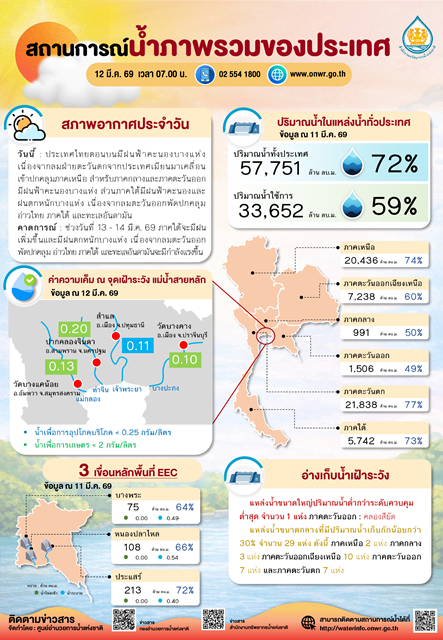 2. สถานการณ์น้ำอ่างเก็บน้ำในภาพรวม : ปริมาณน้ำรวม 72% ของความจุเก็บกัก (57,751 ล้าน ลบ.ม.) ปริมาณน้ำใช้การ 59% (33,652 ล้าน ลบ.ม.)