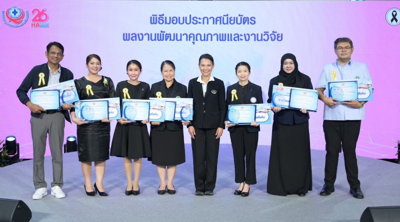 พญ.ปิยวรรณ ลิ้มปัญญาเลิศ ผู้อำนวยการสถาบันรับรองคุณภาพสถานพยาบาล มอบประกาศนียบัตรแก่สถานพยาบาลและบุคลากรด้านสาธารณสุขที่ได้รับรางวัลจากการประกวดผลงานพัฒนาคุณภาพและความปลอดภัย รวมถึงผลงานวิจัย ในการประชุมวิชาการประจำปี HA National Forum ครั้งที่ 26 ในวันที่ 12 มีนาคม 2569 ภายใต้แนวคิด “Compassionate Innovation Shaping the Future of Care” หรือ “นวัตกรรมที่เปี่ยมไปด้วยความใส่ใจ สร้างมิติใหม่ของการดูแล” ณ อิมแพ็ค ฟอรั่ม เมืองทองธานี จ.นนทบุรี
