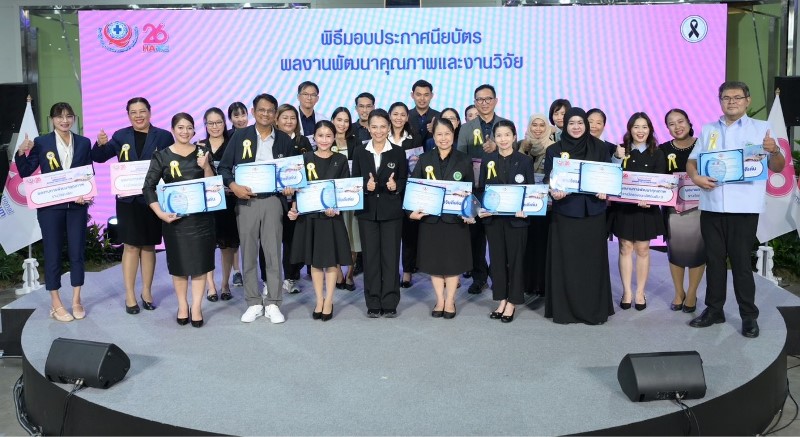 ในส่วนของ รางวัลผลงานวิจัยดีเด่น จำนวน 7 ผลงาน มาจากโรงพยาบาลในหลายพื้นที่ทั่วประเทศ รางวัลชนะเลิศ ได้แก่ ผลงาน “การประยุกต์ใช้เทคโนโลยีดิจิทัลและปัญญาประดิษฐ์เพื่อการพัฒนาคุณภาพและความปลอดภัย (Q-TBI)” โดย ภญ.วิลาศินี เขื่อนแก้ว จากศูนย์การแพทย์มหาวิทยาลัยแม่ฟ้าหลวง จังหวัดเชียงราย รางวัลรองชนะเลิศอันดับ 1 จำนวน 2 ผลงาน ได้แก่ ผลงาน “พลิกฟื้นโรงพยาบาลอย่างยั่งยืน ด้วยหัวใจที่ใส่ใจผู้คน ผ่านกลยุทธ์ “MORPHON Model” โดย พญ. ปัทมพันธ์ อนันตาพงศ์ และคณะกรรมการบริหาร โรงพยาบาลชุมพรเขตรอุดมศักดิ์ จังหวัดชุมพร และ ผลงาน “Dual Elution, Triple Impact: Boost Yield, Slash Cost, Minimize Waste” โดย สุพรรษา กิจประยูร และ Cyclotron Team โรงพยาบาลมะเร็งกรุงเทพวัฒโนสถ กรุงเทพมหานคร และรางวัลรองชนะเลิศอันดับ 2 จำนวน 3 ผลงาน ได้แก่ ผลงาน “Polyethylene suit” ชุดคลุมป้องกันภาวะอุณหภูมิกายต่ำในทารกเกิดก่อนกําหนด โดย นางสาวเรณู ชมพิกุล และ นางสาวนุสรา มะปะเม โรงพยาบาลธรรมศาสตร์เฉลิมพระเกียรติ จังหวัดปทุมธานี, ผลงานเรื่อง ESTIMATA-EX_ นวัตกรรม AI ที่เปี่ยมความใส่ใจ พลิกโฉมความปลอดภัยห้องผ่าตัด MEDCMU โดย นฐธิกานตร์ เจริญรัตนเดชะกูล ร่วมกับ ทีมวิจัย ภาควิชาวิสัญญีวิทยา คณะแพทยศาสตร์ มหาวิทยาลัยเชียงใหม่ และทีมวิจัย ศูนย์เทคโนโลยีอิเล็กทรอนิกส์และคอมพิวเตอร์แห่งชาติ (NECTEC) โรงพยาบาลมหาราชนครเชียงใหม่ จังหวัดเชียงใหม่ และ ผลงาน “Home TPN New Era: ยกระดับการดูแล Short Bowel Syndrome อย่างปลอดภัย” โดย นางสาววรรณา สุวรรณชาตรี โรงพยาบาลสงขลานครินทร์ จังหวัดสงขลา ขณะที่ รางวัลผลงานการพัฒนาคุณภาพ จำนวน 18 ผลงาน แบ่งเป็นหลายระดับรางวัล ได้แก่ รางวัล