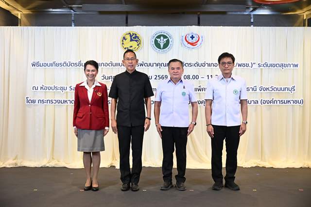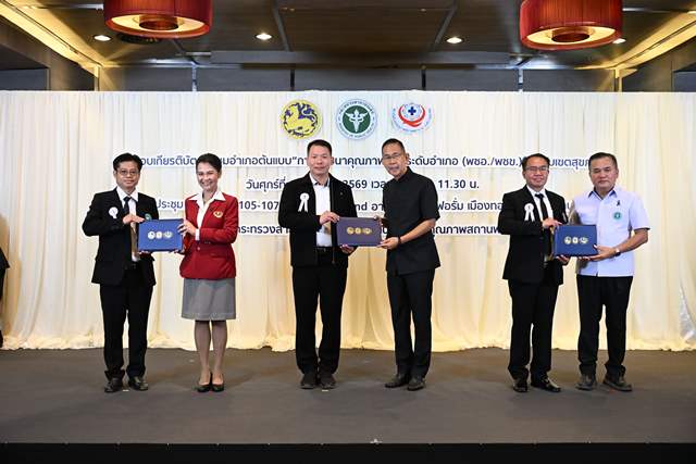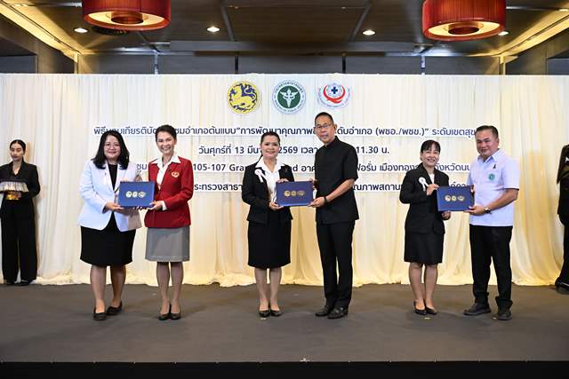 พญ.ปิยวรรณ ลิ้มปัญญาเลิศ ผู้อำนวยการสถาบันรับรองคุณภาพสถานพยาบาล พร้อมด้วย นายชัยวัฒน์ ชื่นโกสุม รองปลัดกระทรวงมหาดไทย และ นายภานุวัฒน์ ปานเกตุ รองปลัดกระทรวงสาธารณสุข ร่วมแสดงความยินดีและมอบเกียรติบัตรชื่นชมอำเภอต้นแบบการพัฒนาคุณภาพชีวิตระดับอำเภอ (พชอ./พชข.) ระดับเขตสุขภาพ ในการประชุมวิชาการประจำปี HA National Forum ครั้งที่ 26 ในวันที่ 13 มีนาคม 2569 ณ อิมแพ็ค ฟอรั่ม เมืองทองธานี จ.นนทบุรี