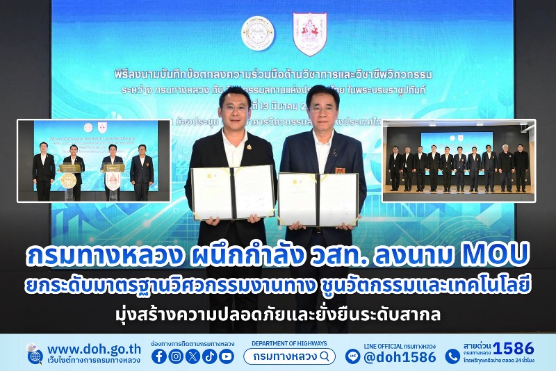 วันที่ 13 มีนาคม 2569 – กรมทางหลวง (ทล.) กระทรวงคมนาคม ร่วมกับ วิศวกรรมสถานแห่งประเทศไทย ในพระบรมราชูปถัมภ์ (วสท.) จัดพิธีลงนามบันทึกข้อตกลงความร่วมมือ (MOU) ด้านวิชาการและวิชาชีพวิศวกรรม มุ่งบูรณาการองค์ความรู้เพื่อขับเคลื่อนโครงสร้างพื้นฐานของไทยสู่ความยั่งยืน ณ ห้องประชุมวิศวกรรมสถานแห่งประเทศไทยฯ โดยมี นายปิยพงษ์ จิวัฒนกุลไพศาล อธิบดีกรมทางหลวง และรองศาสตราจารย์ เอนก ศิริพานิชกร นายกวิศวกรรมสถานแห่งประเทศไทยฯ เป็นผู้ลงนาม ท่ามกลางคณะผู้บริหารและแขกผู้มีเกียรติจากทั้งสององค์กร