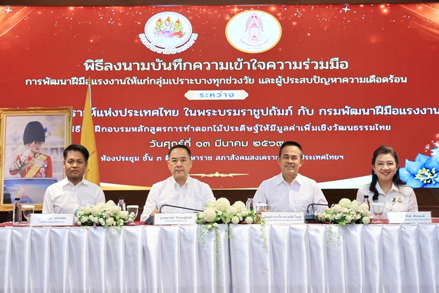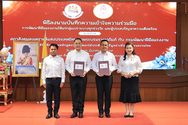 วันที่ 13 มีนาคม 2569 นายสมาสภ์ ปัทมะสุคนธ์ อธิบดีกรมพัฒนาฝีมือแรงงาน ลงนามบันทึกความเข้าใจความร่วมมือการพัฒนาฝีมือแรงงานให้แก่กลุ่มเปราะบางทุกช่วงวัย และผู้ประสบปัญหาความเดือดร้อน กับ ร้อยตำรวจโท ดร.มนัส โนนุช ประธานสภาสังคมสงเคราะห์แห่งประเทศไทย ในพระบรมราชูปถัมภ์ และพิธีเปิดฝึกอบรมหลักสูตรการทำดอกไม้ประดิษฐ์ให้มีมูลค่าเพิ่มเชิงวัฒนธรรมไทย โดยมี นายภัทรวุธ เภอแสละ รองอธิบดีกรมพัฒนาฝีมือแรงงาน และดร. ธิดารักษ์ สัจจพงษ์ เลขาธิการสภาสังคมสงเคราะห์แห่งประเทศไทย ในพระบรมราชูปถัมภ์ เป็นสักขีพยาน และผู้บริหารทั้งสองหน่วยงานร่วมเป็นเกียรติ ณ ห้องประชุม ชั้น 3 ตึกนวมหาราช สภาสังคมสงเคราะห์ฯ