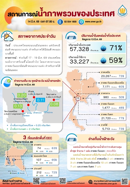 2. สถานการณ์น้ำอ่างเก็บน้ำในภาพรวม : ปริมาณน้ำรวม 71% ของความจุเก็บกัก (57,328 ล้าน ลบ.ม.) ปริมาณน้ำใช้การ 59% (33,227 ล้าน ลบ.ม.)