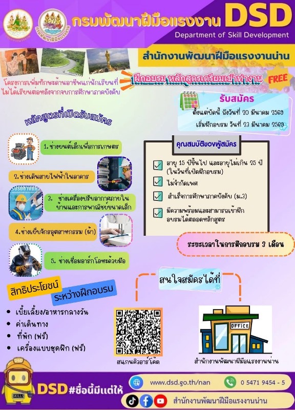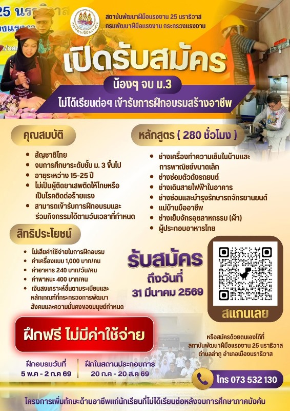 นายสมาสภ์ ปัทมะสุคนธ์ อธิบดีกรมพัฒนาฝีมือแรงงาน เปิดเผยว่า กระทรวงแรงงาน โดยกรมพัฒนาฝีมือแรงงาน ได้ดำเนินโครงการเพิ่มทักษะด้านอาชีพแก่นักเรียนที่ไม่ได้ศึกษาต่อหลังจบการศึกษาภาคบังคับ เพื่อเปิดโอกาสให้เยาวชนที่จบการศึกษาระดับ ม.3 และไม่ได้ศึกษาต่อ ซึ่งมีอายุระหว่าง 15–25 ปี ได้เข้ารับการฝึกอบรม พัฒนาความรู้และทักษะในสาขาอาชีพที่สอดคล้องกับความต้องการของตลาดแรงงาน พร้อมเสริมสร้างโอกาสในการมีงานทำและสร้างรายได้อย่างยั่งยืน สำหรับการฝึกอบรมดังกล่าว มุ่งเน้นการเรียนรู้ทั้งภาคทฤษฎีและภาคปฏิบัติ ใช้ระยะเวลาประมาณ 3 เดือน โดยแบ่งเป็นการฝึกในสถาบันหรือสำนักงานพัฒนาฝีมือแรงงาน 2 เดือน และฝึกประสบการณ์ในสถานประกอบการจริงอีก 1 เดือน เพื่อให้ผู้เข้ารับการฝึกอบรมได้เรียนรู้จากการทำงานจริงก่อนก้าวสู่ตลาดแรงงาน ทั้งนี้ การฝึกอบรมเปิดให้เข้าร่วมโดยไม่เสียค่าใช้จ่าย พร้อมจัดที่พักและอาหารตลอดระยะเวลาการฝึกอบรม อีกทั้งผู้เข้ารับการฝึกยังมีสิทธิได้รับเงินสนับสนุนช่วยเหลือครอบครัว ชุดฝึกอบรม วุฒิบัตรรับรองการฝึก รวมถึงโอกาสในการมีงานทำจากสถานประกอบการที่เข้าฝึกงาน