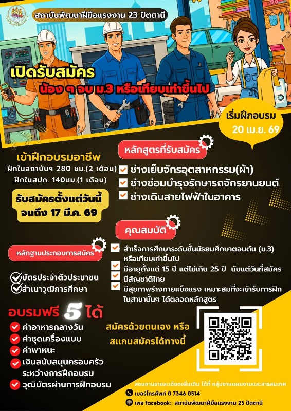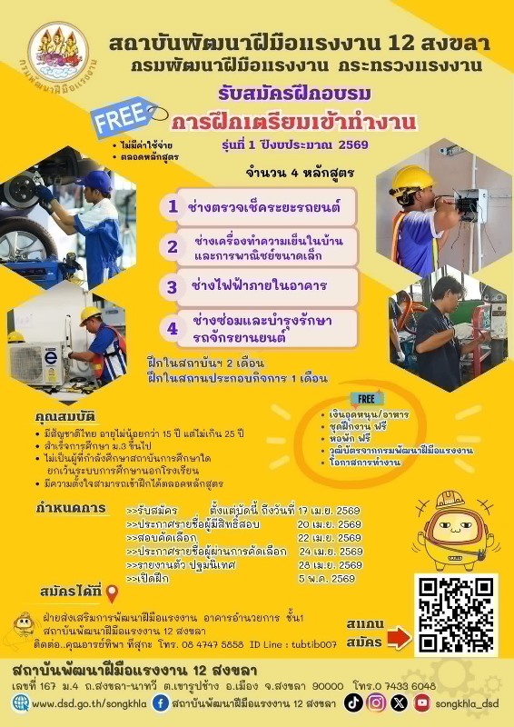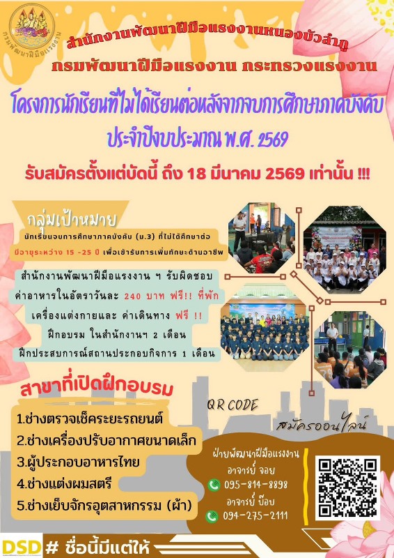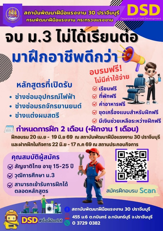 กรมพัฒนาฝีมือแรงงาน เชิญชวนเยาวชนที่ไม่ได้ศึกษาต่อหลังจบการศึกษาภาคบังคับ (ระดับมัธยมศึกษาปีที่ 3) สมัครเข้ารับการฝึกอบรมใน “โครงการเพิ่มทักษะด้านอาชีพแก่นักเรียนที่ไม่ได้เรียนต่อหลังจบการศึกษาภาคบังคับ” เพื่อเปิดโอกาสให้เยาวชนได้พัฒนาทักษะวิชาชีพ และก้าวสู่เส้นทางการมีงานทำอย่างมั่นคงในอนาคต