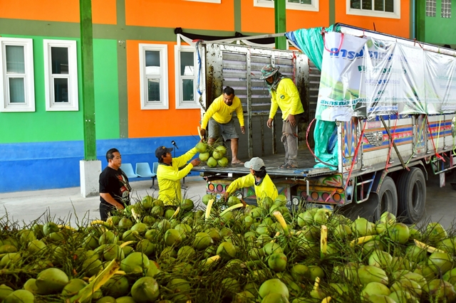 นายสมเกียรติ กล่าวต่อว่า ทุกวันนี้สหกรณ์ฯส่งผลผลิตขายให้ล้งเฉลี่ยวันละ 20,000 – 30,000 ลูก เฉลี่ยลูกละ 5 – 6 บาท โดยคัดเฉพาะลูกได้ขนาดที่ตลาดต้องการ ส่วนที่ตกเกรด สหกรณ์ก็จะนำมาแปรรูปน้ำมะพร้าวบรรจุขวดจำหน่ายต่อไป