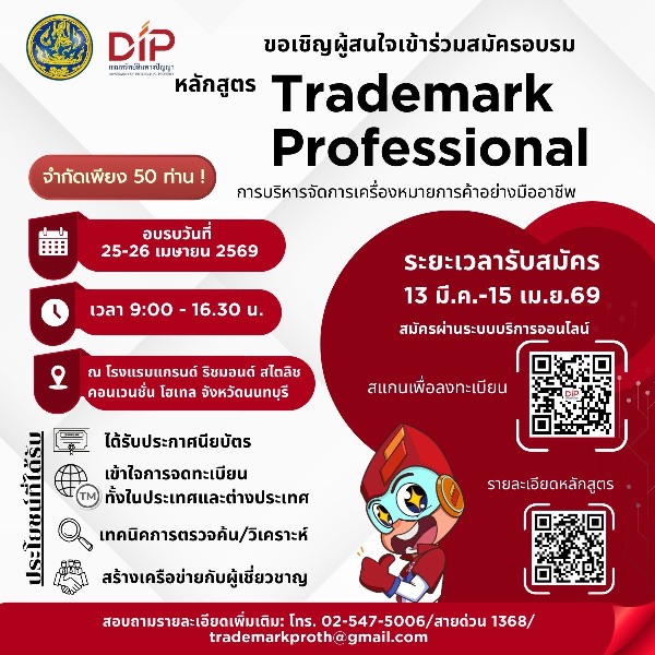 ทั้งนี้ กรมทรัพย์สินทางปัญญาจึงขอเชิญชวนผู้สนใจ สมัครเข้าร่วมหลักสูตร “บริหารจัดการเครื่องหมายการค้าอย่างมืออาชีพ” ผ่านช่องทางออนไลน์ได้ที่ https://qr.ipthailand.go.th/HfsSQSj6 ตั้งแต่วันนี้ ถึง 15 เมษายน 2569 สอบถามรายละเอียดเพิ่มเติมได้ที่กองเครื่องหมายการค้า กรมทรัพย์สินทางปัญญา โทร. 0-2547-5006 สายด่วน 1368 หรือเว็บไซต์ www.ipthailand.go.th