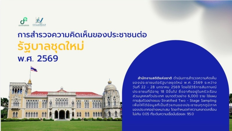 ดร.เอกพงษ์ หริ่มเจริญ ผู้อำนวยการสำนักงานสถิติแห่งชาติ กล่าวว่า “สำนักงานสถิติแห่งชาติ ดำเนินการสำรวจความคิดเห็นของประชาชนต่อรัฐบาลชุดใหม่ พ.ศ. 2569 ระหว่างวันที่ 22 – 28 มกราคม 2569” สรุปผลที่น่าสนใจได้ดังนี้