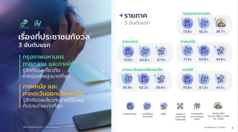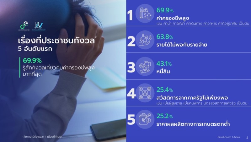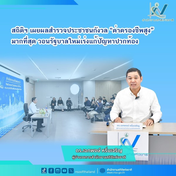 ค่าครองชีพ–รายได้–หนี้สิน ประเด็นหลักที่ประชาชนกังวล : ประชาชนตัวอย่างร้อยละ 69.9 มีความกังวลเกี่ยวกับค่าครองชีพสูงมากที่สุด รองลงมา เช่น รายได้ไม่พอกับรายจ่าย (ร้อยละ 63.8) หนี้สิน (ร้อยละ 43.1) สวัสดิการจากภาครัฐไม่เพียงพอ (ร้อยละ 25.4) และราคาผลผลิตทางการเกษตรตกต่ำ (ร้อยละ 25.2) เป็นต้น