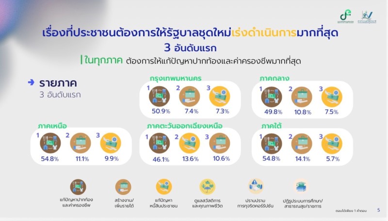 สิ่งที่อยากให้รัฐบาลชุดใหม่ควรเร่งดำเนินการ : ประชาชนตัวอย่างร้อยละ 50.5 ต้องการให้เร่งแก้ไขปัญหาปากท้องและค่าครองชีพมากที่สุด รองลงมา เช่น การสร้างงานและเพิ่มรายได้ (ร้อยละ 10.8) การแก้ไขปัญหาหนี้สินประชาชน (ร้อยละ 9.1) การดูแลสวัสดิการและคุณภาพชีวิต (ร้อยละ 5.8) และการปราบปรามการทุจริตคอร์รัปชัน (ร้อยละ 5.1) เป็นต้น