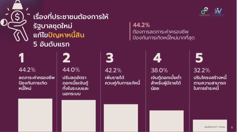 เรื่องที่ประชาชนต้องการให้รัฐบาลชุดใหม่แก้ไขปัญหาหนี้สิน : ประชาชนตัวอย่างร้อยละ 44.2 เห็นว่าควรลดภาระค่าครองชีพและป้องกันการเกิดหนี้ใหม่มากที่สุด รองลงมา เช่น ปรับลดอัตราดอกเบี้ยเงินกู้ทั้งในและนอกระบบ (ร้อยละ 44.0) เพิ่มรายได้ควบคู่กับการแก้หนี้ (ร้อยละ 42.2) เงินกู้ดอกเบี้ยต่ำสำหรับผู้มีรายได้น้อย (ร้อยละ 30.8) และปรับโครงสร้างหนี้ตามความสามารถในการชำระหนี้ (ร้อยละ 32.2) เป็นต้น