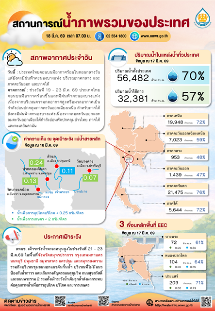 2. สถานการณ์น้ำอ่างเก็บน้ำในภาพรวม : ปริมาณน้ำรวม 70% ของความจุเก็บกัก (56,482 ล้าน ลบ.ม.) ปริมาณน้ำใช้การ 57% (32,381 ล้าน ลบ.ม.)
