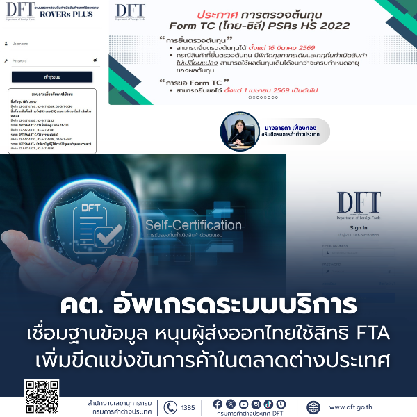 นางอารดา กล่าวเพิ่มเติมว่า นอกจากนี้ กรมฯ ยังได้ปรับปรุงระบบตรวจสอบถิ่นกำเนิดสินค้าแบบไร้กระดาษ (ROVERs PLUS) ในส่วนของการยื่นคำขอตรวจถิ่นกำเนิดสินค้าตามความตกลงเขตการค้าเสรีไทย-ชิลี (TCFTA) เพื่อรองรับการปรับปรุงกฎเฉพาะรายสินค้า (Product Specific Rules: PSRs) จากเดิมที่อ้างอิงตามระบบพิกัดศุลกากรฮาร์โมไนซ์ (Harmonized System: HS) ฉบับปี 2012 (HS 2012) เป็นฉบับปี 2022 (HS 2022) ซึ่งจะมีผลบังคับใช้ตั้งแต่วันที่ 1 เมษายน 2569 เป็นต้นไป อีกด้วย โดย กรมฯ ได้เปิดระบบ ROVERs PLUS ให้ผู้ประกอบการยื่นคำขอตรวจต้นทุนดังกล่าวไปแล้วตั้งแต่วันที่ 16 มีนาคม 2569 เพื่อให้สามารถนำผลต้นทุนไปใช้ประกอบการขอหนังสือรับรองถิ่นกำเนิดสินค้าได้ทันตามกำหนด อย่างไรก็ตาม กรมฯ ขอให้ผู้ประกอบการตรวจสอบพิกัดศุลกากรของสินค้าด้วย หากเป็นสินค้าที่พิกัดฯ ยังคงเดิมและกฎถิ่นกำเนิดสินค้าไม่มีการเปลี่ยนแปลง สามารถใช้ผลต้นทุนเดิมได้จนกว่าจะครบกำหนดอายุของผลต้นทุนดังกล่าว