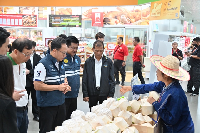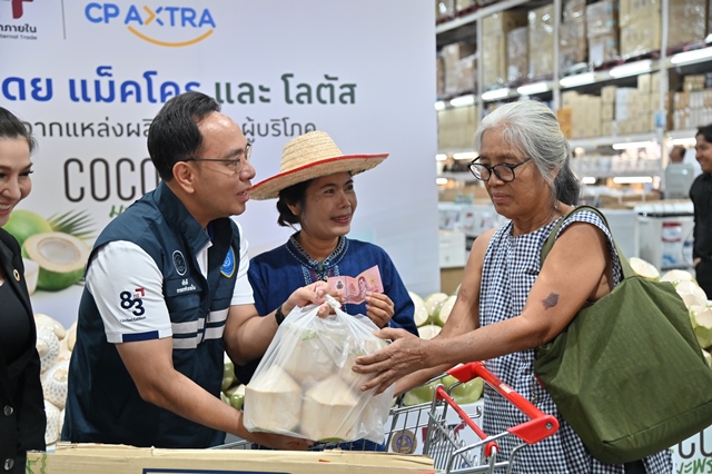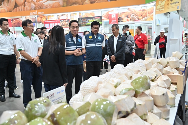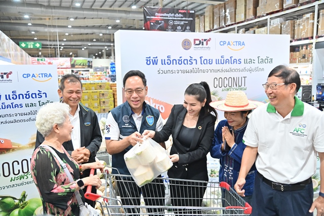 ผลการดำเนินมาตรการ DIT เชื่อมโยงตลาดร่วมกับภาคเอกชน โดย CP Axtra เพิ่มเป้ารับซื้อมะพร้าวน้ำหอมจากเดิม 3 ล้านลูกต่อปี เป็น 6 ล้านลูกในปี 2569 พร้อมตั้งเป้ารับซื้อเร่งด่วนภายในเดือนเมษายนจำนวน 3 ล้านลูก กระจายผ่านช่องทางจำหน่ายกว่า 2,600 สาขาทั่วประเทศ ทั้งนี้ ตั้งแต่ต้นปีสามารถเชื่อมโยงผลผลิตได้แล้วรวม 2,800,500 ลูก คิดเป็นมูลค่ากว่า 45 ล้านบาท แบ่งเป็นการเปิดจุดรับซื้อราคานำตลาด 1,020,000 ลูก ความร่วมมือภาคเอกชนและกิจกรรม CSR 200,000 ลูก การสั่งซื้อผ่านพาณิชย์จังหวัด 180,000 ลูก การกระจายผ่านห้างโมเดิร์นเทรด ตลาดกลาง และตลาดสด 350,000 ลูก การเชื่อมโยงผ่านสถานีบริการน้ำมัน 80,000 ลูก และการเปิดจุดจำหน่ายในพื้นที่ศักยภาพช่วงวันที่ 27 มกราคม–17 มีนาคม 2569 รวม 970,500 ลูก เพื่อเร่งดูดซับผลผลิตและกระจายออกจากแหล่งผลิตอย่างต่อเนื่อง