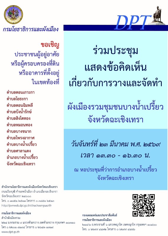 ทั้งนี้ ขอให้ประชาชนในท้องที่ดังกล่าวเข้าร่วมประชุมรับฟังความคิดเห็นและปรึกษาหารือ ในวัน เวลา และสถานที่ ตามที่กำหนด และแสดงความคิดเห็นด้วยวาจาในวันที่มีการประชุมรับฟังความคิดเห็น ของประชาชนตามที่กำหนดไว้ข้างต้นนี้ หรือแสดงความคิดเห็นเป็นหนังสือ หรือแสดงความคิดเห็นทางเว็บไซต์ ของกรมโยธาธิการและผังเมือง (www.dpt.go.th) รวมทั้งมีหนังสือแสดงความคิดเห็นเพื่อให้มีผล เกี่ยวกับสิทธิของตนเพื่อเป็นหลักฐานประกอบในการยื่นคำร้องขอให้แก้ไข เปลี่ยนแปลง หรือยกเลิกข้อกำหนดการใช้ประโยชน์ที่ดินในขั้นตอนการปิดประกาศเป็นเวลาไม่น้อยกว่าเก้าสิบวันตามมาตรา 30 วรรคสอง แห่งพระราชบัญญัติการผังเมือง พ.ศ. 2562 ตั้งแต่วันที่ 23 มีนาคม ถึงวันที่ 7 เมษายน 2569 ซึ่งสามารถขอหนังสือแสดงความคิดเห็นได้ที่กรมโยธาธิการและผังเมือง สำนักงานโยธาธิการและผังเมือง จังหวัดฉะเชิงเทรา สำนักงานเทศบาลตำบลดอนเกาะกา สำนักงานเทศบาลตำบลดอนฉิมพลี สำนักงาน เทศบาลตำบลสิงโตทอง สำนักงานเทศบาลตำบลหมอนทอง สำนักงานเทศบาลตำบลบางขนาก สำนักงาน เทศบาลตำบลคลองแสนแสบ สำนักงานเทศบาลตำบลบางน้ำเปรี้ยว สำนักงานเทศบาลตำบลศาลาแดง ที่ทำการองค์การบริหารส่วนตำบลโยธะกา ที่ทำการองค์การบริหารส่วนตำบลดอนฉิมพลี ที่ทำการ องค์การบริหารส่วนตำบลบึงน้ำรักษ์ ที่ทำการองค์การบริหารส่วนตำบลโพรงอากาศ ที่ทำการองค์การบริหาร ส่วนตำบลบางน้ำเปรี้ยว ที่ทำการองค์การบริหารส่วนตำบลศาลาแดง หรือทางระบบอินเทอร์เน็ต ของกรมโยธาธิการและผังเมือง (www.dpt.go.th)