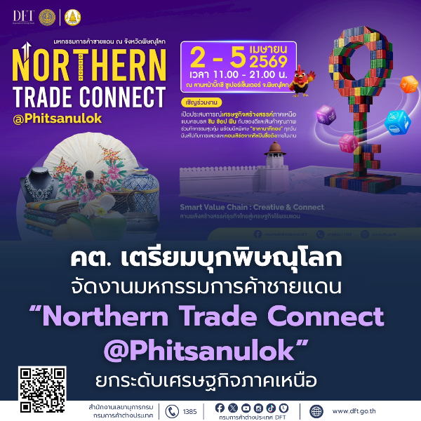กรมการค้าต่างประเทศ (คต.) กระทรวงพาณิชย์ เตรียมจัดงานมหกรรมการค้าชายแดน “Northern Trade Connect @Phitsanulok” ระหว่างวันที่ 2 – 5 เมษายน 2569 ณ ลานหน้าบิ๊กซี ซูเปอร์เซ็นเตอร์ จังหวัดพิษณุโลก และโรงแรม ดิ อิมพีเรียล โฮเท็ล แอนด์ คอนเวนชั่น เซ็นเตอร์ ภายใต้แนวคิด “สานพลังสร้างสรรค์เศรษฐกิจไทยสู่เศรษฐกิจไร้พรมแดน” เพื่อเปิดเวทีการค้าให้ผู้ประกอบการไทยสร้างโอกาสทางการค้าเชื่อมโยงตลาดทั้งในและต่างประเทศ ส่งเสริมการค้าชายแดนและผ่านแดน พร้อมยกระดับเศรษฐกิจภาคเหนืออย่างยั่งยืน
