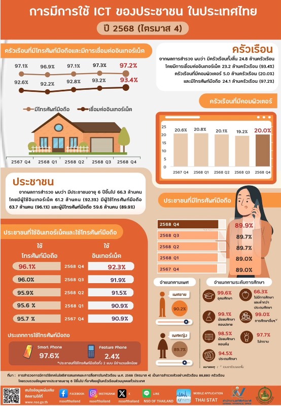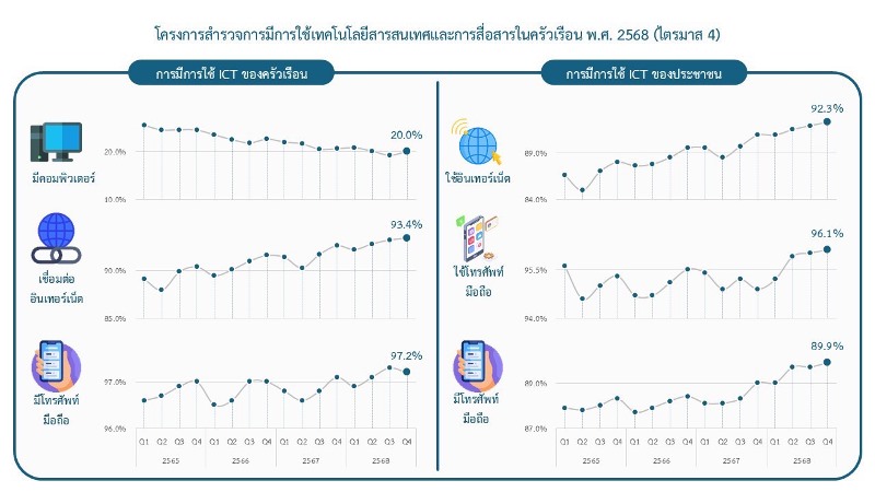 ดร.เอกพงษ์ หริ่มเจริญ ผู้อำนวยการสำนักงานสถิติแห่งชาติ เปิดเผยว่า สำนักงานสถิติแห่งชาติได้ทำการสำรวจการมีการใช้เทคโนโลยีสารสนเทศและการสื่อสารในครัวเรือนต่อเนื่องเป็นประจำทุกไตรมาส จากครัวเรือนส่วนบุคคลตัวอย่าง 86,880 ครัวเรือนทั่วประเทศ เพื่อแสดงให้เห็นถึงการใช้งาน และการเข้าถึงโครงสร้างพื้นฐานด้านเทคโนโลยีสารสนเทศและการสื่อสาร ทั้งการใช้อินเทอร์เน็ต การใช้โทรศัพท์มือถือ และการมีโทรศัพท์มือถือของประชาชน รวมถึงการมีคอมพิวเตอร์ การเชื่อมต่ออินเทอร์เน็ต และการมีโทรศัพท์มือถือของครัวเรือน ซึ่งผลการสำรวจในไตรมาส 4 ปี 2568 สรุปสาระสำคัญได้ดังนี้