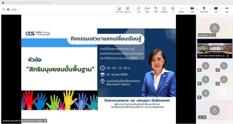 วันศุกร์ที่ 20 มีนาคม 2569 เวลา 09.00 – 12.00 น. อธิบดีกรมคุ้มครองสิทธิและเสรีภาพ ได้มอบหมายให้ ดร.เปรมยุดา ตันติกนกพร ผู้อำนวยการกองส่งเสริมสิทธิและเสรีภาพ เป็นวิทยากรบรรยายให้ความรู้แก่บุคลากรของสำนักงานคณะกรรมการกฤษฎีกา ภายใต้โครงการการจัดการความรู้ ประจำปีงบประมาณ พ.ศ. 2569 ผ่านสื่อออนไลน์ โดยมีกลุ่มเป้าหมาย จำนวน 60 คน