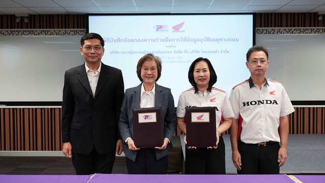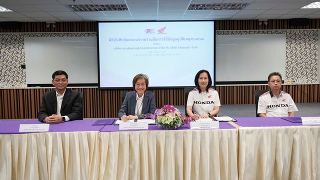 นางสาวพรรณี ปิติกุลตัง กรรมการผู้จัดการ บริษัท กลางคุ้มครองผู้ประสบภัยจากรถ จำกัด พร้อมด้วย นางสาวิตรี แก้วพวงงาม กรรมการบริหาร บริษัท ไทยฮอนด้า จำกัด ร่วมลงนามในบันทึกข้อตกลงความร่วมมือด้านการใช้ข้อมูลอุบัติเหตุทางถนน
