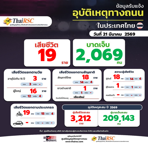 สถานการณ์อุบัติเหตุทางถนนในประเทศไทย รายสัปดาห์ 15-21 มี.ค.69 22 มีนาคม 2026Thailandplusประชาสัมพันธ์ Facebook iconFacebookTwitter iconTwitterLINE iconLineสถานการณ์อุบัติเหตุทางถนนในประเทศไทย วันที่ 21 มี.ค.69
