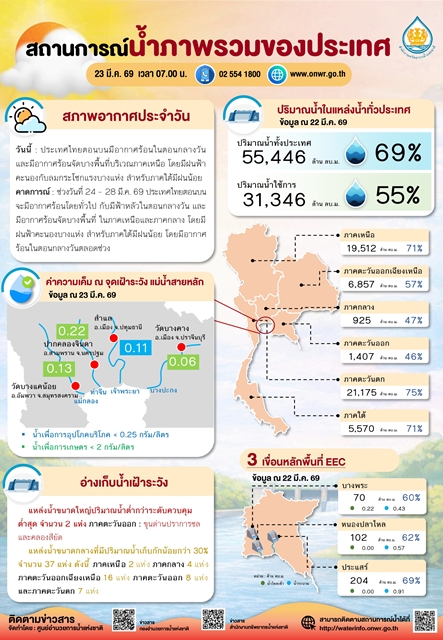 2. สถานการณ์น้ำอ่างเก็บน้ำในภาพรวม : ปริมาณน้ำรวม 69% ของความจุเก็บกัก (55,446 ล้าน ลบ.ม.) ปริมาณน้ำใช้การ 55% (31,346 ล้าน ลบ.ม.)