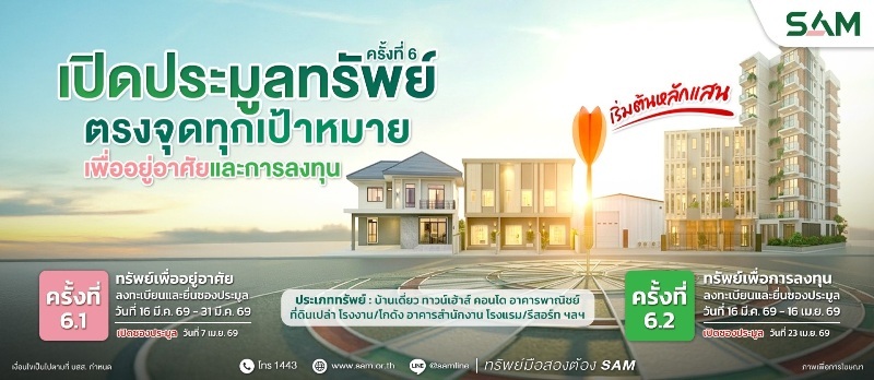 ทั้งนี้ ผู้สนใจเข้าร่วมประมูลสามารถลงทะเบียนและยื่นซองประมูล พร้อมเอกสารประกอบการ ประมูลที่กำหนดได้ที่สำนักงานใหญ่ SAM อาคารซันทาวเวอร์ส ถ.วิภาวดีรังสิต กรุงเทพฯ หรือสอบถามรายละเอียดเพิ่มเติมได้ที่ Call Center 1443 กด 2 และดูรายละเอียดทรัพย์สินได้ทางเว็บไซต์ที่ www.sam.or.th รวมทั้งช่องทางออนไลน์ที่หลากหลายและสะดวกรวดเร็ว โดยแอด ID Line @Samline ติดตาม Facebook /YouTube / TikTok ได้ที่ “SAM บริหารสินทรัพย์สุขุมวิท” เพื่อติดตามข้อมูลข่าวสารดี ๆ จาก SAM