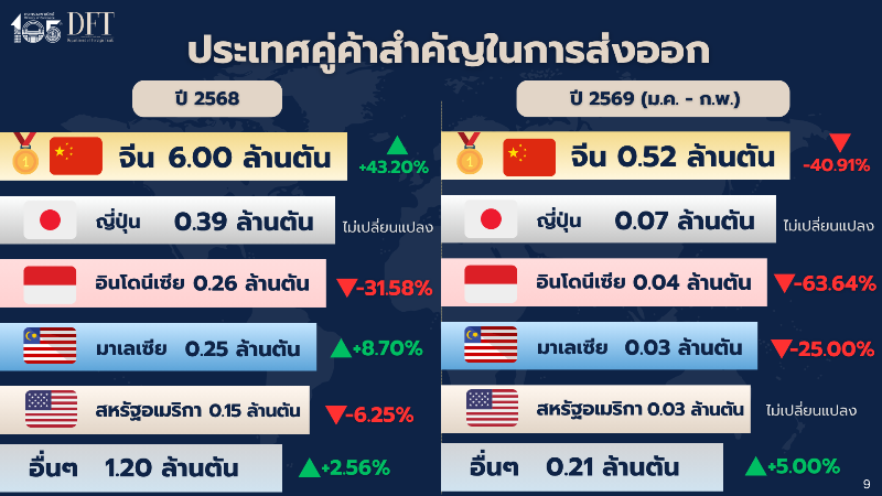 กระทรวงพาณิชย์โดยกรมการค้าต่างประเทศ เปิดเผยตัวเลขการส่งออกมันอัดเม็ด 2 เดือนแรกของปี 2569 (มกราคม – กุมภาพันธ์) ว่ามีปริมาณการส่งออก 0.07 ล้านตัน มูลค่า 419.50 ล้านบาท ปริมาณและมูลค่าเพิ่มขึ้นสูงถึงร้อยละ 133.33 และ ร้อยละ 132.87 เมื่อเทียบกับช่วงเดียวกันของปีก่อน อย่างไรก็ดี ภาพรวมการส่งออกสินค้ามันสำปะหลัง ในช่วงเดียวกันปรับตัวลดลง โดยมีปริมาณการส่งออกสินค้ามันสำปะหลังรวม 0.90 ล้านตัน มูลค่า 12,310.14 ล้านบาท ลดลงร้อยละ 32.33 และ ร้อยละ 27.24 ตามลำดับ เมื่อเทียบกับช่วงเดียวกันของปีก่อนที่มีการส่งออก 1.33 ล้านตัน มูลค่า 16,918.00 ล้านบาท สาเหตุจากผู้ประกอบการอยู่ระหว่างรวบรวมผลผลิตเพื่อนำไปแปรรูป ส่งผลให้ผู้ซื้อในต่างประเทศชะลอคำสั่งในการซื้อขาย