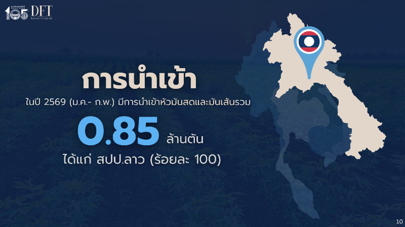 ทั้งนี้ กรมการค้าต่างประเทศยังคงมุ่งมั่นเดินหน้าขับเคลื่อนแผนการขยายตลาดส่งออกมันสำปะหลังอย่างต่อเนื่องตลอดปี 2569 โดยเน้นการเพิ่มปริมาณการส่งออกในตลาดใหม่ที่ประสบความสำเร็จในการเปิดตลาดแล้ว ควบคู่กับการแสวงหาโอกาสในตลาดและอุตสาหกรรมใหม่ที่มีศักยภาพ เพื่อรักษาระดับการส่งออกมันสำปะหลังของไทยให้เติบโตอย่างต่อเนื่อง และสร้างความมั่นคงให้แก่เกษตรกรและผู้ประกอบการไทยในระยะยาว