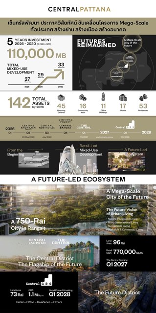 กรุงเทพฯ – บริษัท เซ็นทรัลพัฒนา จำกัด (มหาชน) ผู้นำเบอร์หนึ่งอสังหาริมทรัพย์ไทยเพื่อความยั่งยืน ตอกย้ำความสำเร็จโมเดลธุรกิจ Retail-Led Mixed-Use Development ที่ขยายอิมแพคครอบคลุมทุกมิติทั่วประเทศ โดยภายในงานแถลงข่าวประจำปี 2569 ประกาศวิสัยทัศน์ ‘A Future-Led Ecosystem’ การพัฒนาแห่งอนาคต เผย Landmark Masterplans ของเมกะโปรเจกต์ในกรุงเทพฯ, เชียงใหม่, ภูเก็ต และขอนแก่น พร้อมเดินหน้าขับเคลื่อนเศรษฐกิจ กรุงเทพฯ และประเทศไทยสู่ระดับโลก รวมถึงแผนขยายโครงการอสังหาริมทรัพย์ต่างๆ ทั้งออฟฟิศ, โรงแรม และที่อยู่อาศัยที่เติบโตแข็งแกร่งต่อเนื่อง