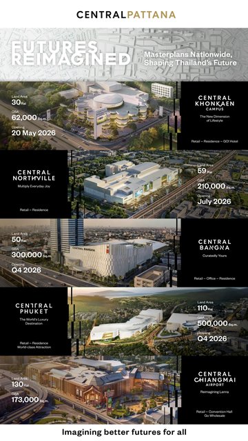 - พลิกโฉม Landmark Masterplans ที่กรุงเทพฯ ตะวันออกเตรียมพบกับ ‘The New Central Bangna’ ปลายปี 69 และเมืองท่องเที่ยวสำคัญพลิกโฉม ‘Central Chiangmai Airport’ ขนทัพ แบรนด์ดังอีกเพียบ และ ‘Central Phuket’ แผนขยายและปรับโฉมขึ้นแท่น The World’s Luxury Destination ที่ดีที่สุดนอกกรุงเทพฯ