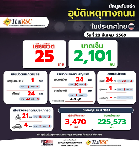 สถานการณ์อุบัติเหตุทางถนนในประเทศไทย รายสัปดาห์ 22-28 มี.ค.69 29 มีนาคม 2026Thailandplusประชาสัมพันธ์ Facebook iconFacebookTwitter iconTwitterLINE iconLineสถานการณ์อุบัติเหตุทางถนนในประเทศไทย วันที่ 28 มี.ค.69