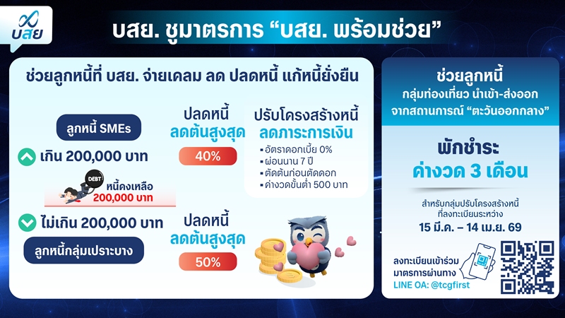 สำหรับผู้ประกอบการ SMEs ลูกหนี้ บสย. ที่ต้องการปรับโครงสร้างหนี้ หรือ SMEs กลุ่มธุรกิจท่องเที่ยว ธุรกิจนำเข้า-ส่งออกที่เกี่ยวเนื่อง ที่ได้รับผลกระทบจากสถานการณ์ความขัดแย้งในตะวันออกกลาง สามารถสอบถามรายละเอียด และแจ้งความประสงค์เข้าร่วมมาตรการ ได้ที่สำนักงานเขตในพื้นที่ หรือช่องทาง LINE OA : @tcgfirst และ บสย. Call Center โทร. 02-890-9999