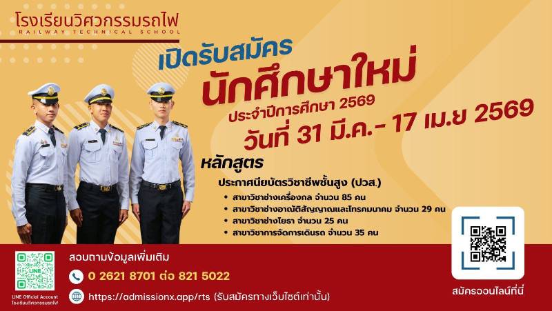 โอกาสมาแล้ว! โรงเรียนวิศวกรรมรถไฟ เปิดรับสมัครนักเรียนใหม่ ปี 2569 ระดับชั้น ปวช. และมัธยมศึกษาตอนปลาย สมัครออนไลน์ได้ถึง 17 เมษายนนี้